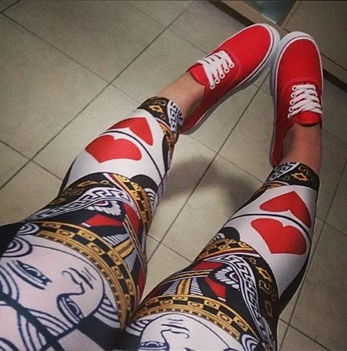 Poker Print Red Heart Queen Leggings - Black / 4XL