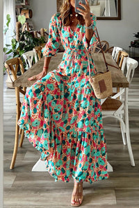Looking for a dress that will make you stand out in the crowd? Look no further than our Multicolor Bohemia Print V Neck Ruffle Long Sleeve Maxi Dress!